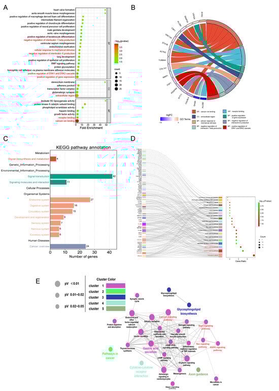 Further, the main terms of GO enrichment analysis with their associated genes are shown in a chord diagram (Figure 6B). The KEGG pathway annotation showed that the signal transduction subgroup had the largest number of annotated genes (Figure 6C). The Sankey-Bubble plot revealed the three most significantly enriched pathways, including pathways in cancer, the calcium signaling pathway, and the MAPK signaling pathway. The pathways in cancer include the MAPK signaling pathway. Combined with gene enrichment on the left, KEGG pathway enrichment analysis showed that the most enriched genes were PRKCG, PDGFRA, FGF2, CALML4, PLCB2 and RYR2 (Figure 6D). The network model of interactions between the signaling pathways revealed that the calcium signaling pathway, the Rap1 signaling pathway, the Ras signaling pathway, and the MAPK signaling pathway were interconnected with many other signaling pathways, highlighting their significance in signal transduction (Figure 6E).