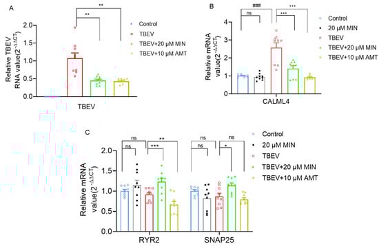Previous studies have revealed that calcium ions can affect the replication of Orthoflavivirus [,]. To verify the transcriptomic analysis results and investigate whether MIN could potentially impact calcium homeostasis in TBEV-infected Vero cells by regulating the calcium signaling pathway, some key genes associated with the calcium channels identified via transcriptome analysis were evaluated with individual specific primers, such as CALML4, RYR2, and SNAP25. The RT-qPCR results were consistent with the transcriptomic analysis results, confirming the accuracy of the transcriptome sequencing. Compared with the Vero cells group (control group), the mRNA expression of CALML4 and TBEV RNA significantly increased in the TBEV-infected group, while the changes were reversed in the 20 μM MIN and 10 μM AMT groups, with statistical significance (Figure 7A,B). Additionally, compared with the Vero cells group, the mRNA expression of RYR2 and SNAP25 decreased in the TBEV-infected group, while the 20 μM MIN treatment significantly increased the mRNA expression levels of both RYR2 and SNAP25 compared with those of the TBEV-infected group (Figure 7C). Meanwhile, results showed that, compared with the Vero cells group, the mRNA expression levels of CALML4, RYR2, and SNAP25 were no different in the 20 µM MIN group. This suggests that the treatment with MIN in TBEV-infected Vero cells efficiently regulates the calcium signaling pathway-associated proteins.