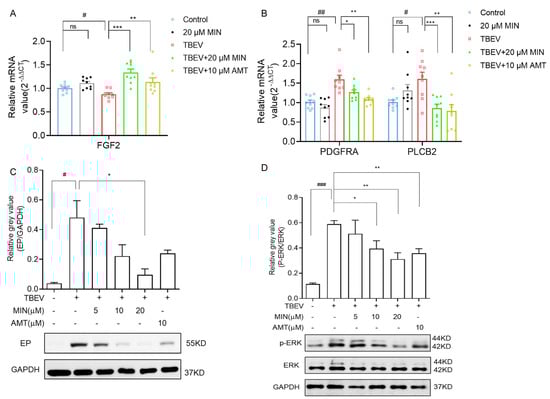 Evaluation of the effects of MIN on inhibition of the MAPK-ERK signaling pathway in TBEV-infected Vero cells. (A,B) The RT-qPCR of the mRNA level of FGF2, PDGFRA, and PLCB2. (C,D) Western blot of the expression levels of the TBEV envelope protein (EP) and p-ERK/ERK. Quantitative analysis of the average gray values of TBEV and p-ERK/ERK after normalization against GAPDH. The difference between the two groups was analyzed using an independent sample t-test, compared with the TBEV group, it was expressed by “*”, * (p < 0.05), ** (p < 0.01), and *** (p < 0.001), and compared with the Vero cells group, it was expressed by “#”, # (p < 0.05), ## (p < 0.01), and ### (p < 0.001), the ns symbol represented no significant difference.