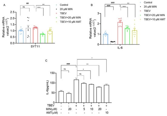 Evaluation of the effects of MIN on the reduced IL-6 expression level in TBEV-infected Vero cells. (A,B) RT-qPCR off the mRNA level of SYT11 and IL-6. (C) The level of IL-6 in the supernatant of the TBEV-infected Vero cells measured using an ELISA kit. Control: without TBEV infection. The difference between the two groups was analyzed using an independent sample t-test, compared with the TBEV group, it was expressed by “*”, * (p < 0.05), ** (p < 0.01), and *** (p < 0.001), and compared with the Vero cells group, it was expressed by “#”, ## (p < 0.01), and ### (p < 0.001); the ns symbol represented no significant difference.