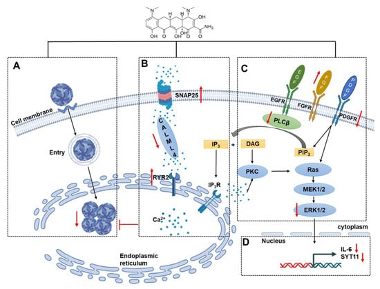IL-6, a multifunctional cytokine regulated by the MAPK-ERK signaling pathway, plays a crucial role in the body’s defense against inflammation [,]. Synaptotagmin 11 (SYT11) is a synaptotagmin that inhibits the secretion of the cytokine IL-6 []. Other studies have shown that TBEV infection produces large amounts of IL-6, which triggers an inflammatory response []. Reducing the increased IL-6 and SYT11 levels in TBEV-infected Vero cells using MIN may reflect the reversal of inflammatory responses by TBEV. As it is a tetracycline antibiotic, MIN mediates many biological processes in TBEV-infected Vero cells.