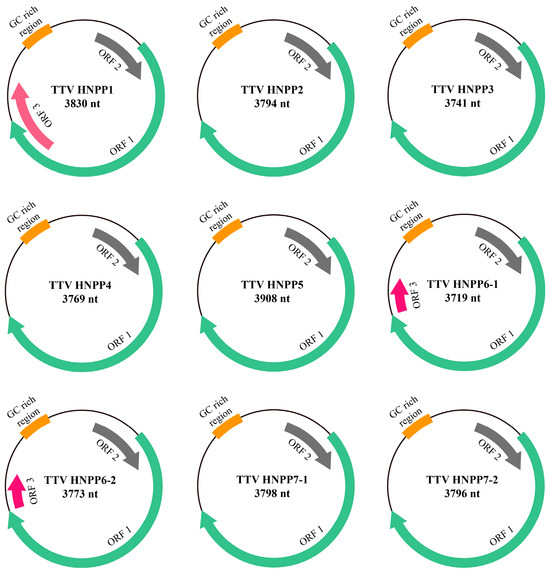 The circular genomic DNA of the nine novel TTV strains displays a range of lengths from 3719 nt to 3908 nt, with a GC content ranging from 50.7% to 53.4%, respectively (Table S1). The genomes were annotated via BLASTx and BLASTp searches, and two typical open reading frames (ORF1 and ORF2) of the nine novel TTVs were identified. The two ORFs were aligned as 5′UTR-ORF1-ORF2-3′UTR. Moreover, an additional ORF3 was identified in HNPP1, HNPP6-1, and HNPP6-2. As shown in Figure 1, the TTV coding sequences are arranged in a clockwise direction on the same strand of circular single-stranded DNA, which is similar to other TTVs (Figure 1). The accurate locations and lengths of the predicted ORFs, as well as the molecular weights of the corresponding proteins, are listed in Table 2.