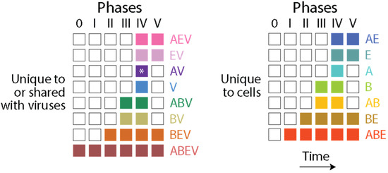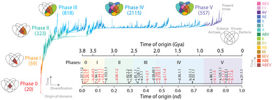 The distribution of domain families belonging to Archaea, Bacteria, Eukarya and viruses defines a Venn diagram in which Venn groups describe sharing patterns between these supergroups (Figure 1). One expectation from both the profile distribution of family occurrence and abundance in the phylogenetic data matrix and compliance with Weston’s generality criterion is that the most ancient families should populate the deep branches of the ToD or the basal positions of the chronology, and that conversely, newer families should be located toward the crown of the tree or in derived positions of the timeline. The progression of evolutionary appearance of Venn groups, which was consistently recovered in four studies that included viruses [23,24,37,38], followed a specific temporal order that fulfilled that expectation. The Venn-group labels of Figure 1 are ordered (bottom to top) according to their appearance in the evolutionary timeline. This order delimited six evolutionary phases and two universal ancestors of life, which is the last universal common ancestor (LUCA) and the last universal cellular ancestor (LUCellA). Some implications of phases and ancestors were discussed in ref. [13]. Phase 0 (nulla in roman numerals; communal world) was only populated by universal families present in proteomes of cellular organisms and in many viruses. Phase I (rise of viral ancestors) was populated by universal families and by a minority of families common to all superkingdoms. Phase II (birth of archaeal ancestors) comprised four Venn groups (ABEV, ABE, BEV, and BE) and defined an ancestral stem line of cellular descent. Phase III (diversified Bacteria) harbored more than half of the Venn groups, all of them involving Bacteria. Finally, Phases IV and V introduced the rest of the Venn groups, including virus-specific families (VSFs) corresponding to Venn group V.