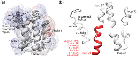 The loop structures of the non-structural protein 7 (NSP 7) of coronaviruses. (a) An alignment of the best 20 conformers of SARS-CoV NSP7 obtained by energy minimization from NMR screening (PDB entry 1YSY). The solution structure consists of an up–down–up ‘helical sheet’ composed of α-helices 2, 3 and 4, which packs on one of its sides an N-terminal region of loosely winded helices that together with α-helices 2 and 3 forms a 3-helix bundle. A semi-transparent surface representation embeds the cartoon structure of the backbone and is colored according to Coulombic electrostatic potentials (positive values in blue reflect positively charged surfaces). (b) Dissection of the fold structure into an N-terminal helical region and 4 loop structures, one of which (loop 29) matches a non-modular loop prototype (colored red) that embeds highly conserved and likely functional sites [52,53]. The loop prototype is indexed with type of bracing secondary structures (H stands for α-helix), the four ArchDB internal coordinates (distance between boundaries of aperiodic structure (D), hoist angle (δ), packing angle (θ), and meridian angle (ρ)) and time of origin (nd).