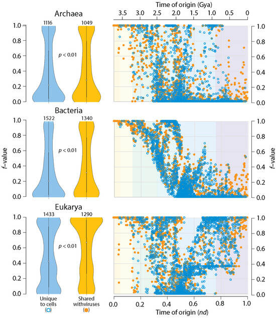 A simple comparative proteomic exercise reveals that structural domains that are shared with viruses are more widely represented in the proteomes of organisms belonging to Archaea, Bacteria and Eukarya (Figure 3). A distribution index (f-value) that measures how many proteomes harbor individual domains, over all domains that are known, shows that viruses help spread the wealth of domains. This is an expected result. Two studies have already reported this finding [23,25]. However, I here extend the analysis by mapping f-values of domains unique to cells or shared with viruses along the domain chronology described in Figure 1 (Table S1). Remarkably, domains shared with viruses that appear late in the timeline had significantly higher f-values than cell-unique domains with similar times of origin. These were especially evident in plots for Archaea and Bacteria (Figure 3). It is noteworthy that the origin of these domains followed the appearance of 95 virus-specific domains in Phase IV at nd = 0.47–0.53. These VSF domains, which are absent in superkingdoms but are present in viruses (Venn group V), include domains defining capsid/coat proteins necessary for the formation of virions. Thus, viruses help spread domain wealth among a diversifying world of organisms, suggesting they are not ‘passive’ contributors to the structures and functions of the cellular world.
