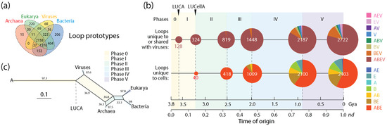 A similar analysis of non-modular loop prototypes unique to or shared with viruses (2722) relative to the number of prototypes unique to cells (2403) was also revealing (Figure 5). The analysis supported the concept of viruses mediating the formation of structural domains from loops in protein history and in doing so spreading domain wealth in superkingdoms (observed in Figure 3). Remarkably, evolutionary trends in domain history (Figure 4b) were preserved in the loop history (Figure 5b), including an identical sequence of Venn-group appearances in the timeline. In fact, a phylogenetic network reconstructed from Venn-group distributions of loop structures (Figure 5c) was congruent with the phylogenetic network reconstructed from Venn-group distributions of domains (Figure 4c). Such congruency provides strong support to the evolutionary progression and sequential origin of ancestors of viruses, Archaea, Bacteria, and Eukarya, in that order. Within the confines of remarkably similar evolutionary trends, the numbers of emerging prototypes were substantially larger than those of domain building blocks in all Venn-group categories appearing between Phase 0 and the inflection point of Phase III, especially prototypes that originated earlier and/or were widely spread, such as those belonging to the universal ABEV and ABE sets (compare Figure 4 and Figure 5). The inflection point at the end of Phase III merits discussion since Phases IV and V are part of the ‘organismal diversification’ epoch of protein evolution and likely involve canonical organismal lineages rather than stem lines of descent [54,55,56,57]. The inflection point coincides with the inflection point clearly visible in f-value distribution plots that occur at about nd~0.5 (1.8 Gya) probably triggered by a massive rise of eukaryotic lineages (Figure 3). Note that loop prototypes and associated domains in the ABEV, ABE, BEV and BE categories originated continuously throughout the timeline, showing horizontal exchange processes were pervasive. The large number of widely shared prior molecular states probably reflects the origination and massive recruitment of loops and domains, which is a process that occurred throughout the timeline and is likely ongoing [13,45,47,58]. The number of loop prototypes involving viruses was also larger than those involving cells (Figure 5b). To illustrate, the percentage of prototypes belonging to the ABEV category in prototypes unique to or shared with viruses decreased from 100% in Phase 0 to 96.3% at end of Phase III and then to 79.2% in the extant protein world (Figure 4b). In turn, prototypes unique to cells belonging to the ABE category decreased from 100% in Phase 0 to 88.5% at the end of Phase III and then to 57.3% in present times. Clearly, sharing loops with viruses pushes them to become even more widely shared, especially during the last two evolutionary phases of the timeline.