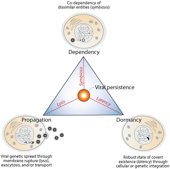 Viruses enter into obligatory intracellular interactions with their hosts and are often endogenized and domesticated, impacting their long-term evolution. They enter into propagation, dependency, and dormancy modes mediated by lysis, symbiosis and latency, respectively [110]. These modes, which achieve different solution goals, have been impactful in the evolution of holobionts and can be illustrated with a triangle of viral persistence (Figure 7). Lysis (and other cellular mechanisms) favors the spread (propagation) of virus genetic material and opportunities for mutational innovation (flexibility through evolutionary plasticity). Spread can be mediated by the destruction of infected cells, budding via exocytosis, or cell-to-cell transport depending on viruses and the biological system. Symbiosis favors intimate association with the host (dependency) by fostering mutualism, commensalism, amensalism, and/or parasitism via economy-driven altruistic, cooperative, or antagonistic behaviors. Finally, latency favors cellular stasis (dormancy) through mechanisms of robustness, generally via episomes or the endogenization of genetic material. The triangle of virus persistence offers a morphospace of trade-offs between flexibility, economy and robustness that highlights how viruses are fully integrated with their hosts and impact their evolution [110].