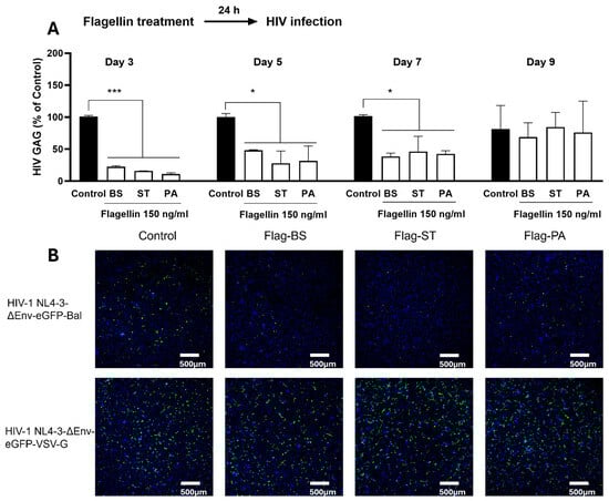 Flagellin blocks HIV-1 infection of primary human monocyte-derived macrophages (MDMs). (A) Effect of the flagellins on HIV-1 infection. MDMs were treated with the flagellins of different bacteria (BS: bacillus subtilis; ST: salmonella typhimurium; and PA: pseudomonas aeruginosa) for 24 h before HIV-1 Bal (20 ng/106 cells) infection. Following the 2 h incubation of HIV-1 Bal strain, the cell cultures were then washed 3 times to remove the residue of the input viruses and the flagellins. The cells were not treated with flagellins after HIV-1 infection. The culture supernatant was collected at indicated time points after HIV-1 infection and subjected to the real-time PCR for HIV-1 gag gene. Data are expressed as mean ± SD of triplicate cultures, representative of three independent experiments. Data were analyzed with one-way ANOVA (* p < 0.05, *** p < 0.001). (B) Fluorescent imaging of HIV-1 entry to MDMs. MDMs were treated with flagellins for 24 h before HIV-1 infection. The same amount of HIV-1 NL4-3-ΔEnv-eGFP-Bal or VSV-G was added. Following 24 h incubation of HIV-1, the media was replaced with fresh media and infected cells were cultured for 3 days. The cells were then photographed under a confocal microscope (Nikon, A1R, Tokyo, Japan) for green fluorescence measurement. (Scale bar = 500 μm).