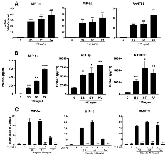 Effect of flagellin–TLR5 on the CC chemokines in monocyte-derived macrophages (MDMs). (A) MDMs were treated with or without flagellins from three different bacteria (BS: bacillus subtilis; ST: salmonella typhimurium; and PA: pseudomonas aeruginosa) at the indicated concentration for 12 h. Total RNA extracted from the cells was subjected to the real-time RT-PCR for the mRNA of the indicated CC chemokines (MIP-1α, MIP-1β and RANTES). (B) MDMs were treated with or without flagellins from three different bacteria (BS: bacillus subtilis; ST: salmonella typhimurium; and PA: pseudomonas aeruginosa) for 24 h. Supernatants were collected from the cell cultures and subjected to ELISA analysis to measure the protein level of CC chemokines. (C) The toll-like 5 receptor antagonist (TLR5-Fc) blocked the flagellin-mediated induction of the CC chemokines. MDMs were incubated with or without hTLR5-Fc (300 ng/mL) for 1 h before the flagellin (150 ng/mL) treatment for 6 h. Total RNA extracted from the cells was subjected to real-time RT-PCR for the mRNA expression of the CC chemokines. Data are expressed as mean ± SD of triplicate cultures and were analyzed with one-way ANOVA (* p < 0.05; ** p < 0.01, *** p < 0.001).