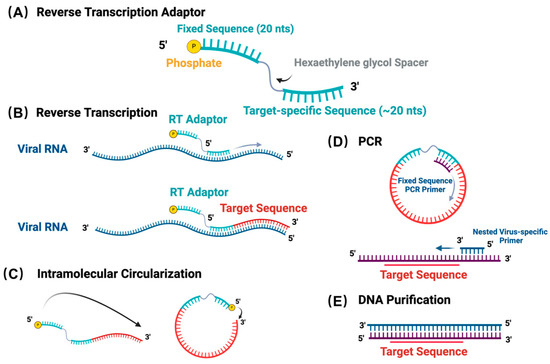 Workflow of the ViBE-Seq protocol. (A) Schematic of the general reverse transcription adaptor structure. (B) Reverse transcription of viral RNA target sequence using phosphorylated reverse transcription adaptor. (C) Intramolecular circularization of target sequence and phosphorylated RT adaptor following cDNA purification. (D) Polymerase chain reaction with a nested set of primers. (E) DNA purification with a product containing the target 5′ end of viral RNA.