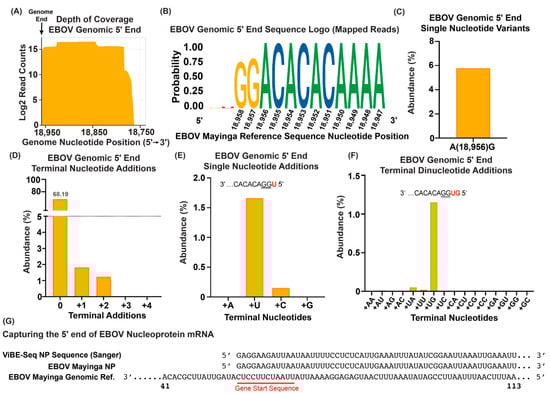 We next explored whether ViBE-Seq was suitable for determining the 5′ ends of viral RNAs isolated from EBOV-infected cells. This approach aimed at validating ViBE-Seq’s sensitivity in complex mixtures of both cellular and viral RNAs. Total RNA isolated from EBOV-infected Vero E6 cells 24 h post-infection was used as a template for ViBE-Seq using Sensiscript (50 ng) or Omniscript (200 ng) reverse transcriptase. We were successful in obtaining nucleotide-resolution sequencing data for the complete EBOV genomic 5′ end despite the high abundance of non-template RNA species (Figure 3A). A consensus analysis of these sequences revealed little variation in the annotated 5′ end with a low abundance of 5′ terminal additions (Figure 3B). Single-nucleotide variants analyzed with LoFreq revealed that 5.8% of mapped sequences contained an internal A to G mutation at nucleotide 18,956 that was not present in the data derived from virion RNA (Figure 3C) [36]. Compared with the ViBE-Seq results obtained with virion RNA, we observed a higher frequency of truncations prior to the 5′ terminal GG residues (Figure 3B). Only 68.19% of the EBOV sequences isolated from infected cells contained an intact trailer with no terminal nucleotide additions. Less than 2% of the intact EBOV genome sequences contained one or two terminal nucleotide additions. We did not observe sequence reads that contained three or more terminal nucleotide additions (Figure 3D). Similar to what was observed for virion RNA (Figure 2D,E), the most abundant single-nucleotide addition was a U residue (1.66%) and the most frequent dinucleotide addition was UG, followed by UA and UU (Figure 3E,F). To gauge ViBE-Seq’s utility to positive-strand RNA, we next aimed to capture the 5′ end of the EBOV nucleoprotein (NP; first gene) mRNA. Using total RNA isolated from EBOV-infected cells, we were able to capture the 5′ end of the EBOV NP mRNA. In this case, the sequence of the ViBE-Seq product was determined by Sanger sequencing (Figure 3G). This result validates that ViBE-Seq can be used to determine the 5′ ends of both positive-sense and negative-sense viral RNAs. Also, Sanger sequencing may be useful as a read-out if significant sequence variation is not expected in the final product.