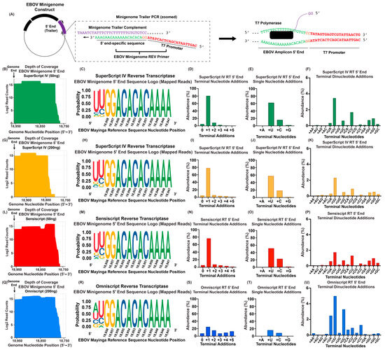 Using ViBE-Seq to determine terminal transferase activity of various reverse transcriptases. (A) Schematic of PCR primer containing T7 promoter and in vitro RNA synthesis of the EBOV minigenome 5′ end. Orange GG in REV primer denotes the overlap between T7 promoter and genome terminus. (B) Depth of sequencing coverage of the 5′ end of the EBOV minigenome trailer cDNA using SuperScript IV reverse transcriptase with 50 ng of input RNA. The vertical black line depicts the published 5′ end of the viral genome. Results are graphed in a Log2 scale. (C) Sequence logo of anchored reads mapped to the EBOV genomic 5′ end. Genomic sequence shown in 5′ to 3′ orientation. (D) Percent abundances of terminal nucleotide additions observed in reads mapped to the EBOV genomic 5′ end. (E) Percent abundances of 5′ single-nucleotide additions from (C). (F) Percent abundances of 5′ terminal dinucleotide additions from (C). (G) Depth of sequencing coverage of the 5′ end of the EBOV minigenome trailer cDNA using SuperScript IV reverse transcriptase with 200 ng of input RNA. (H) Sequence logo of anchored reads mapped to the EBOV genomic 5′ end. Genomic sequence shown in 5′ to 3′ orientation. (I) Percent abundances of terminal nucleotide additions in reads mapped to the EBOV genomic 5′ end. (J) Percent abundances of 5′ single-nucleotide additions from (I). (K) Percent abundances of EBOV genomic 5′ terminal dinucleotide additions from (I). (L) Depth of sequencing coverage of the 5′ end of the EBOV minigenome trailer cDNA using Sensiscript RT with 50 ng of input RNA. The vertical black line depicts the published 5′ end of the viral genome. Results are graphed in a Log2 scale. (M) Sequence logo of anchored reads mapped to the EBOV genomic 5′ end. Genomic sequence shown in 5′ to 3′ orientation. (N) Percent abundances of terminal nucleotide additions observed in reads mapped to the EBOV genomic 5′ end. (O) Percent abundances of 5′ single-nucleotide additions from (N). (P) Percent abundances of EBOV genomic 5′ terminal dinucleotide additions from (N). (Q) Depth of sequencing coverage of the 5′ end of the EBOV minigenome trailer cDNA using Omniscript RT with 200 ng of input RNA. (R) Sequence logo of anchored reads mapped to the EBOV genomic 5′ end. Genomic sequence shown in 5′ to 3′ orientation. (S) Percent abundances of terminal nucleotide additions in reads mapped to the EBOV genomic 5′ end. (T) Percent abundances of 5′ single-nucleotide additions from (S). (U) Percent abundances of EBOV genomic 5′ terminal dinucleotide additions from (S).