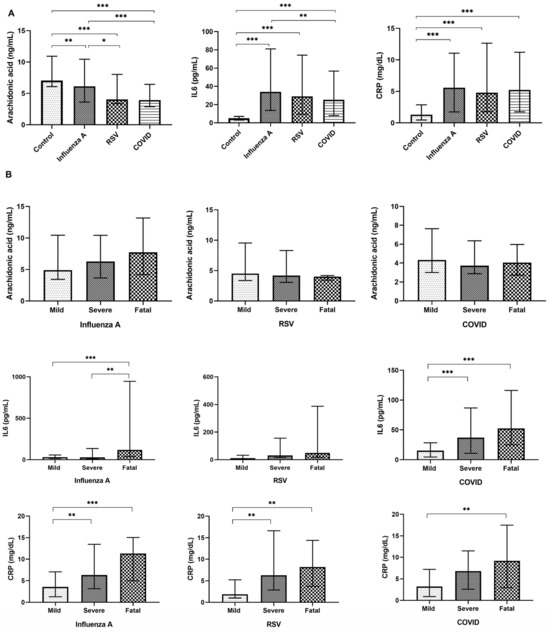 Bar plot representation illustrating the serum concentrations of arachidonic acid, interleukin-6, and C-reactive protein in healthy controls (n = 104), Influenza A patients (n = 172), respiratory syncytial virus patients (n = 80), and COVID-19 patients (n = 217), categorized by viral pathogen (A) and disease severity (B). The top and bottom lines of bars are the 25th and 75th percentiles, respectively, and the line in the middle of the bar is the median. Significance levels: * p < 0.05; ** p ≤ 0.01; *** p < 0.001.