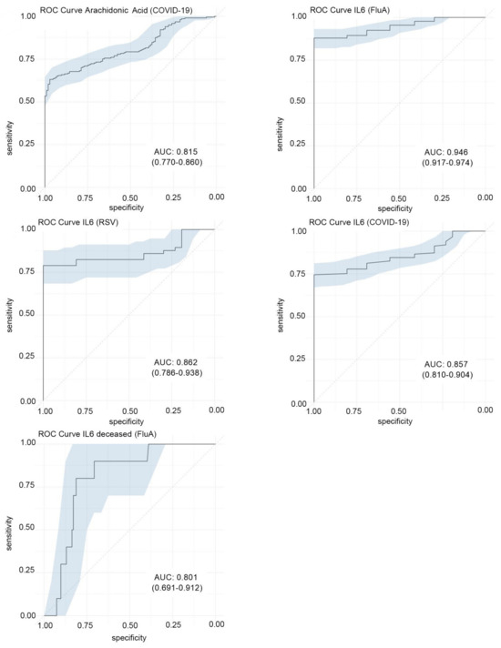 Receiver operating characteristic (ROC) curves with areas under the curve (AUC) greater than 0.80 in the distinction between patients and healthy controls and between survivors and deceased. Numbers in parentheses show the 95% CI of the AUCs. AA: arachidonic acid; FluA: Influenza A, IL6: Interleukin-6. The cutoffs of the different curves, from left to right and from top to bottom were: 6.03 ng/mL (sensitivity: 71%, specificity: 77%); 8.54 pg/mL (sensitivity = 88%, specificity = 100%); 7.35 pg/mL (sensitivity = 83%, specificity = 81%); 7.10 pg/mL (sensitivity = 78%, specificity = 81%); and 85.6 pg/mL (sensitivity = 80%, specificity = 81%).