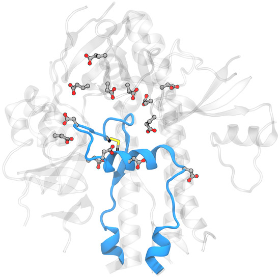 Model system for the spike FPPR region showing the protein backbone in blue for the extended-conformation FPPR and gray for the surrounding region. Asp, Glu, and Cys are shown in licorice (PDB ID 6XM0, FPPR from chain B).
