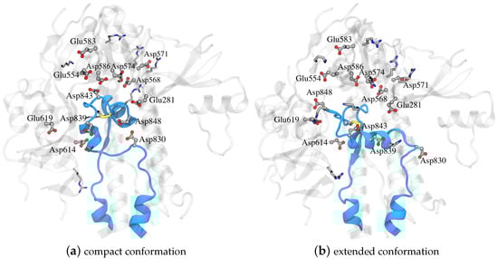 We next explored a structural basis for these calculated pKa shifts. In the compact conformation, the positioning of Asp848 at the N-terminal end of the helix (Ncap), as shown in Figure 4, may contribute to the observed lower pKa value due to interaction with the helix macrodipole [58]. In contrast, in the extended conformation, Asp848 is not situated at the N-terminal of the helix, resulting in the pKa being relatively unchanged from the reference value.