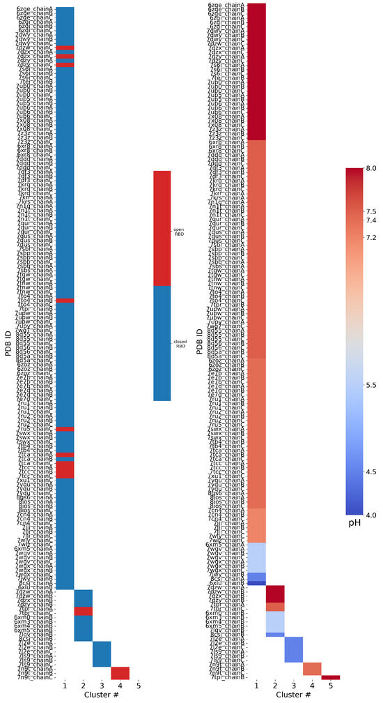 Results of FPPR cluster analysis applied to spike PDB structures. The PDB code and chain ID are given next to a colored box that is placed in the column according to the FPPR cluster number. The box color indicates the position of the RBD above the FPPR (left) or the pH of the experiment (right).