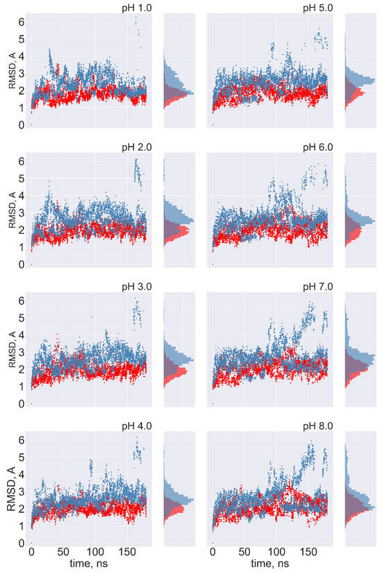 The FPPR remains in the initial conformation during simulations of extended and compact FPPRs. FPPR RMSD values are shown at different pH values during two pH-REMD simulations, each initiated with a different FPPR conformation. Red symbols—initially extended simulation, with backbone RMSD calculated using the experimental extended conformation; blue symbols—initially compact simulation, with backbone RMSD calculated using the experimental compact conformation. Low values indicate that the initial FPPR conformation is stable.