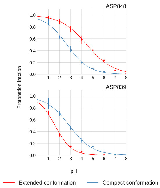 Only Asp848 and Asp839 exhibit distinct titration curve patterns between the compact and extended FPPRs, as shown in Figure 8. In the compact conformation, Asp848 displays a downshifted pKa of , while in the extended conformation, the pKa is . Asp839 is downshifted in both FPPR conformations ( in the compact conformation and even lower at in the extended conformation), as seen in Figure 8.