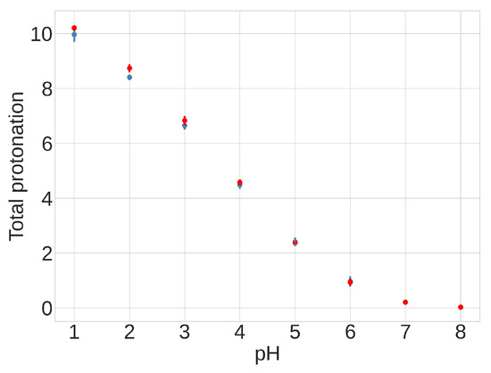 Results from pH-REMD simulations showing the relationship between the total protonation of titratable groups and pH. The Y-axis shows the average number of protonated acidic groups, with a maximum of 13 (total number of Asp and Glu titrated): red—extended FPPR conformation; blue—compact FPPR conformation. Error bars are from independent simulations of the same FPPR conformation type.