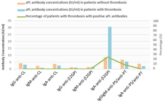 The relationship between the presence of thrombosis and the serum aPL concentration was also analysed. Although not statistically significant, the values of IgA anti-β2GPI were markedly elevated in patients with thrombosis compared to patients without thrombosis (30.6 ± 82.3 IU/mL vs. 8.5 ± 40.9 IU/mL) (Figure 1).