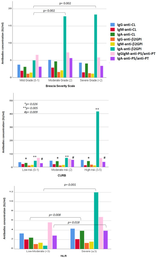 A multivariate analysis showed that positivity for IgA anti-β2GPI is significantly associated with disease severity measured by CURB-65 OR (CI 95%) 17.8 (1.7–187), where p = 0.0016.