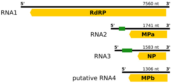 Within the family Phenuiviridae, rubodviruses represent one of five genera, which are known to infect plant hosts, either exclusively or in conjunction with insects: Coguvirus, Laulavirus, Mechlorovirus, Rubodvirus, and Tenuivirus [5]. Based on sequences of RdRP and NP, coguviruses and laulaviruses were identified as the closest relatives of rubodviruses [6]. Both coguviruses and laulaviruses encode the same three proteins as rubodviruses: RdRP, NP, and MP. While in laulaviruses each protein is encoded on a separate segment [7] like in tripartite rubodviruses, the genome of coguviruses is bipartite and one of its segments harbors both NP and MP genes in ambisense orientation [8]. Tenuiviruses encode one more non-structural protein on the fourth genome segment [9], and the genus Mechlorovirus possesses eight different genomic segments [10].
