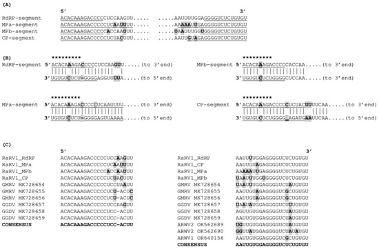 5′UTR and 3′UTR terminal sequences of the raspberry rubodvirus 1 (RaRV1). (A) Conservation of inverted repeats at the ends of vRNAs of RaRV1; bases predicted by RNAfold software to participate in end-to-end pairing are underlined; (B) Complementarity of IR at the 5′ and 3′ ends of the same segment; bases predicted by RNAfold software to participate in end-to-end pairing are underlined (the same as in (A)); bases of the 5′ end previously reported in other bunyavirids to form nonpairing hooks bound to RdRP are marked by asterisks above the sequence; (C) Alignment of the 5′ and 3′ ends of different available rubodviruses. All mismatches from consensus sequence in (A–C) are in bold and shaded in grey.