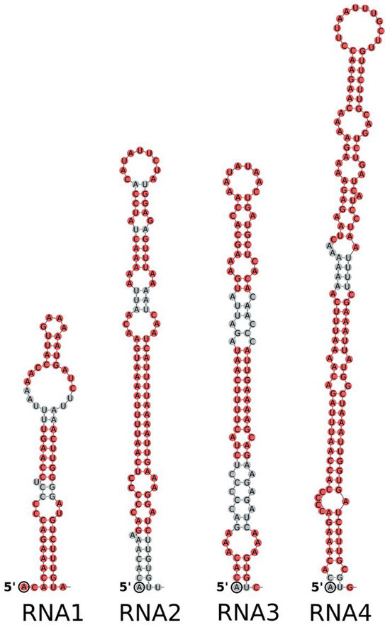 - Lorenz, R.; Bernhart, S.H.; Höner Zu Siederdissen, C.; Tafer, H.; Flamm, C.; Stadler, P.F.; Hofacker, I.L. ViennaRNA Package 2.0. Algorithms. Mol. Biol. 2011, 6, 26. [Google Scholar] [CrossRef]