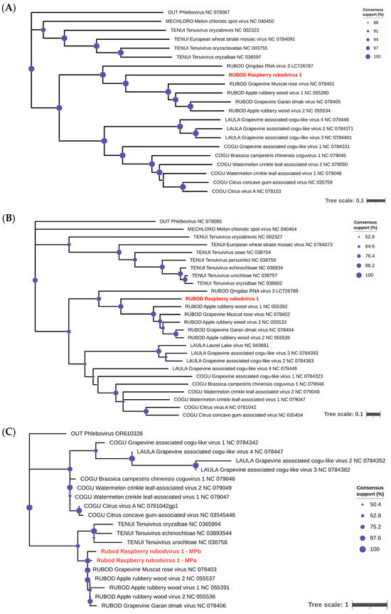 Alignments of the nucleotide and amino acid sequences of the putative proteins revealed that RaRV1, similarly to QRV3, was more distantly related to the other rubodviruses. The average interspecies distances between proteins of ARWV1, ARWV2, GGDV, and GMRV ranged from 49.8 to 90.6% in aa identity (49.8–61.6% for RdRP, 67.6–90.6% for NP, 54.9–81.5% for MPa, and 55.4–81.7% for MPb, if present); however, the maximum aa identity of RaRV1 proteins to this group was only 45.3% (Table 2 and Table S3). In phylogenetic trees of selected plant phenuivirids based on RdRP, MP, and NP, all of the rubodviruses clustered into a monophyletic group, although RaRV1 (and QRV3) was more distant (Figure 4). Interestingly, the MPs of the rubodviruses shared the closest ancestor with those of the tenuiviruses (Figure 4C), while among the RdRP and NP, those of the rubodviruses were more closely related to those of the cogu- and laulaviruses.