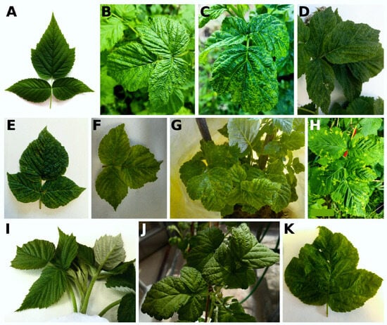 Symptomatic raspberry plants infected with the raspberry rubodvirus 1 (RaRV1) and healthy control. (A) cv. Tulameen, B730—healthy control; (B) V2 (B350)—vein clearing, mosaic, leaf curl; (C) V4 (A805)—vein clearing, mosaic, leaf curl; (D) V5 (A806)—vein clearing, yellowing; (E) MC1 (A986)—vein clearing, yellowing; (F) MC2 (CG757)—vein clearing, yellowing, necrosis; (G) CH525 (B631, B632)—vein clearing, mosaic; (H) NB1 (A807)—yellow blotches, leaf malformation, (I) D23 (B315)—no symptoms; (J) H1 (B467)—leaf curling; (K) O4M (CF863)—vein clearing, yellowing.