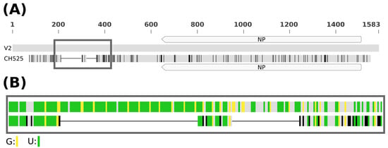 Comparison of U-rich regions between the V2 and CH525 isolates of raspberry rubodvirus 1 (RaRV1). (A) Position of U-rich regions on both sequences (in rectangle), (B) more detailed view of U-rich regions with highlighted uridine (green) and guanosine (yellow) nucleotides. In both schemes, nucleotides of CH525 isolate differing from those of V2 isolate are marked black.