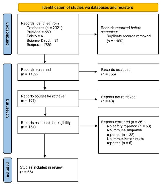 The following variables were extracted from the selected studies: title; authors; year of publication; country of publication; sample size; species; immunogen type; immunization route; vaccine safety measured by temperature, weight, behavior, leukocyte count, and survival; and efficacy through specific antibody (Ab) production measured either with neutralization assays or with ELISA. In studies where viral challenge was reported, the inoculation route and challenge survival were also retrieved. All information regarding the included studies was synthesized in figures and tables.