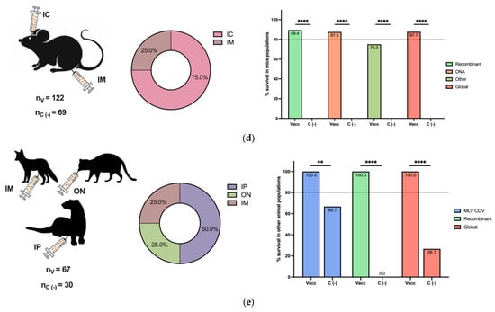 The efficacy of the CDV challenge is reported in Figure 3 for different animal populations. As expected, the dog was the most common animal included in vaccine and challenge studies, followed by ferrets and mice (Figure 3a–e, left panels). Intranasal, oral, and oronasal CDV inoculation was broadly employed in dogs, ferrets, and minks (Figure 3a–c, middle panels), since this route could simulate a natural CDV infection, in contrast to other routes, such as IM, IC, and IP, among others, used for mice and other animals (Figure 3d,e, middle panels).