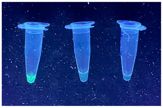 Visualization of fluorescence resulting from potato spindle tuber viroid (PSTVd) detection. From left to right, PSTVd RNA, water control, and healthy host RNA samples.