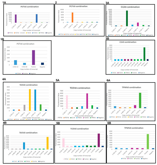 Specificity assay of six pospiviroids and their LOD. (1A) specificity test on all six pospiviroid RNA transcripts with high copy number using PSTVd combination 1; (1B) specificity test on serially diluted TCDVd transcripts using PSTVd combination 1. PSTVd RNA in 1A was used as a positive control in 1B. Healthy plant RNA was used as a negative control; (2) specificity test on all six pospiviroid RNA transcripts with high copy number using PCFVd combination 1; No dilution of other pospiviroids was performed for PCFVd combination 1 since it can specifically detect PCFVd. (3A) specificity test on all six pospiviroid RNA transcripts with high copy number using CLVd combination 1; (3B) specificity test on serially diluted TASVd, TCDVd and TPMVd transcripts using CLVd combination 1. CLVd RNA in 3A was used as a positive control in 3B. Healthy plant RNA was used as a negative control; (4A) specificity test on all six pospiviroid RNA transcripts with high copy number using TASVd combination 1; (4B) specificity test on serially diluted CLVd, TASVd, TCDVd and TPMVd transcripts using TASVd combination 1. TASVd RNA in 4A was used as a positive control in 4B. Healthy plant RNA was used as a negative control; (5A) specificity test on all six pospiviroid RNA transcripts with high copy number using TCDVd combination; (5B) specificity test on serially diluted PSTVd, TASVd, and TPMVd transcripts using TCDVd combination. TCDVd RNA in 5A was used as a positive control in 5B. Healthy plant RNA was used as a negative control; (6A) specificity test on all six pospiviroid RNA transcripts with high copy number using TPMVd combination; (6B) specificity test on serially diluted PSTVd, TCDVd transcripts using TPMVd combination. TPMVd RNA in 6A was used as a positive control in 6B. Healthy plant RNA was used as a negative control. All experiments were repeated three times with similar results obtained. X-axis represents the copy number of RNA transcript. Y-axis represents the fluorescence value.