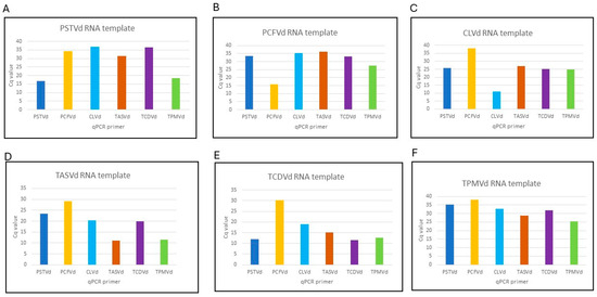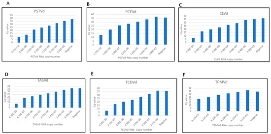 Sensitivity analysis of real-time RT-PCR detection of six pospiviroids (A–F). All experiments were repeated three times with similar results obtained. X-axis represents the copy number of serially diluted RNA transcript. Y-axis represents the Cq value.