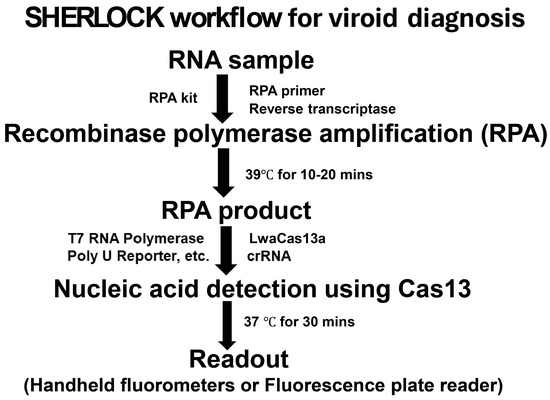 Currently, viroids are detected by real-time RT-PCR. CRISPR/Cas-based genome editing has been increasingly used for virus detection in the past five years [15,16,17,18,19,20,21,22,23,24]. Different from Cas9, both Cas12 and Cas 13 proteins possess collateral or trans-cleavage activity. Cas12 is an endonuclease guided by crRNA to find the target DNA sequence, and then cuts both strands and the collateral DNA. Cas13 is an RNA-guided RNase which cleaves single-stranded and collateral RNAs. In both Cas12-based DNA endonuclease-targeted CRISPR trans reporter (DETECTR) [25] and Cas13-based Specific High-sensitivity Enzymatic Reporter unLOCKing (SHERLOCK) [26] systems, fluorescence signals can be generated via separation of the quencher from the reporter DNA/RNA by target recognition. In this work, we used a rapid SHERLOCK platform for pospiviroid detection. This platform combines recombinase polymerase amplification (RPA) with CRISPR and CRISPR-associated (CRISPR-Cas) RNA-guided endoribonuclease. It is highly specific in differentiating closely related pospiviroid pathogens, does not require expensive equipment, and can be adapted for on-site detection. To our knowledge, this is the first report of using SHERLOCK to detect pospiviroids of quarantine interest.