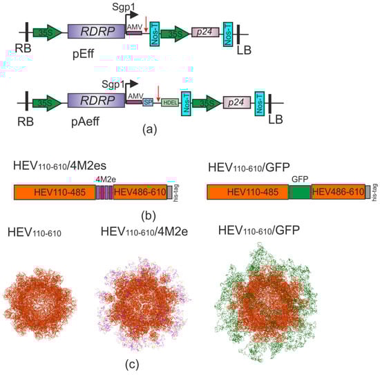 - Mardanova, E.S.; Kotlyarov, R.Y.; Stuchinskaya, M.D.; Nikolaeva, L.I.; Zahmanova, G.; Ravin, N.V. High-Yield Production of Chimeric Hepatitis E Virus-Like Particles Bearing the M2e Influenza Epitope and Receptor Binding Domain of SARS-CoV-2 in Plants Using Viral Vectors. Int. J. Mol. Sci. 2022, 23, 15684. [Google Scholar] [CrossRef] [PubMed]