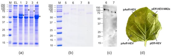 - Zahmanova, G.G.; Mazalovska, M.; Takova, K.H.; Toneva, V.T.; Minkov, I.N.; Mardanova, E.S.; Ravin, N.V.; Lomonossoff, G.P. Rapid High-Yield Transient Expression of Swine Hepatitis E ORF2 Capsid Proteins in Nicotiana Benthamiana Plants and Production of Chimeric Hepatitis E Virus-Like Particles Bearing the M2e Influenza Epitope. Plants 2020, 9, 29. [Google Scholar] [CrossRef] [PubMed]