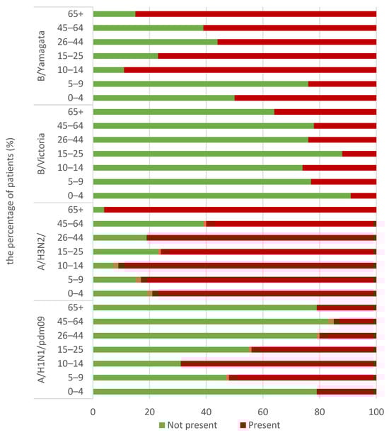 This study showed that among the study group, 242 patients had antibodies against A/Victoria/2570/2019 (H1N1)pdm09 (34.6% [31.1–38.1]) (the limits of the 95% confidence interval in square brackets). The largest group, i.e., the group with 566 patients (80.9% [78.0–83.8]), had antibodies against A/Darwin/9/2021 (H3N2) in their serum. Only 152 patients (21.7% [18.6–24.8]) had antibodies against B/Austria/1359417/2021 (B/Victoria lineage), while the antibodies against B/Phuket/3073/2013 (B/Yamagata lineage) were present in the sera of 442 patients (63.1% [59.5–66.7]).