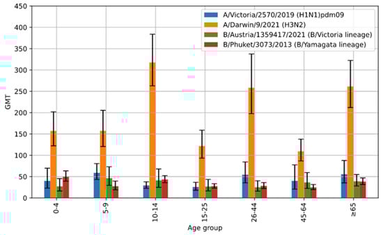 Statistically, the average level of antibodies against A/Victoria/2570/2019 (H1N1)pdm09, A/Darwin/9/2021 (H3N2) and B/Phuket/3073/2013 (B/Yamagata lineage) in the particular age groups varied significantly (p < 0.001), and only the average level of antibodies against B/Austria/1359417/2021 (B/Victoria lineage) in the particular age groups did not vary significantly. This difference is due to the fact that the latter antibodies were the least common (the compared groups were small; when calculating the geometric mean, only people with non-zero levels of antibodies were taken into account).