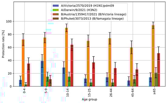 Compared to the results of the protection rate for all antigens obtained in this study, the highest values of the protection rate were recorded for hemagglutinin A/H3N2/—76.4 [73.3–79.5]% for all patients. Relatively high values of the protection rate were also recorded for B/Yamagata line (B/Phuket): 36.0 [32.4–39.6]% (total number of patients). For A/H1N1/pdm09, this value was 18.1 [15.2–21.0]%, and for B/Austria/1359417/2021, it was 11.0 [8.7–13.3]%.