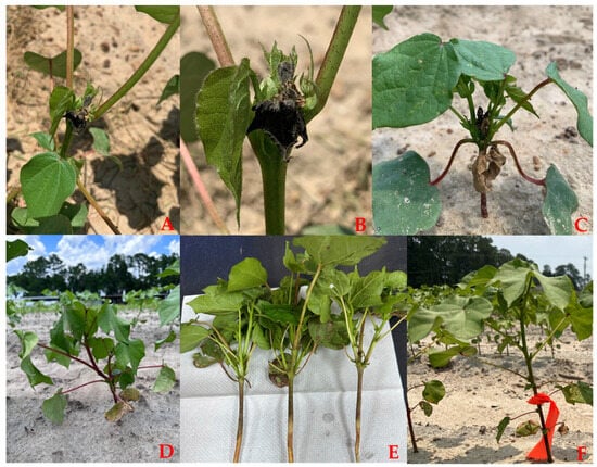 Terminal abortion symptoms in cotton plants; (A,B) terminal abortion at primary growth stages (2–4 true leaf stage) of cotton seedlings in the field; (C) initial stage of terminal abortion resulting in profuse vegetative branching; (D) symptomatic plant in the experimental plot in Tift County; (E) vegetative branching from Expo-Colquitt and Hopeful-Mitchell counties, GA; (F) asymptomatic plant without any vegetative branching. Photo Credit: S.E., P.C. and S.B.