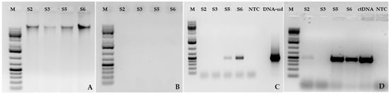 Before conducting the PCR assay, aliquots of four commercial cotton field composite DNA samples were treated with exonuclease V. This enzyme cleaves linear double-stranded DNA in both 5′ and 3′ directions, enabling caulimovirus circular episomal DNA detection [30]. Similarly, TNA from the seeds of two varieties, DG3615 (n = 10) and ST4595 (n = 10), was treated with exonuclease V to detect the presence of episomal forms of DNA. This treatment was crucial to distinguishing the target episomal DNA from integrated EVE sequences in G. hirsutum species. In this treatment, DNA < 1 μg was mixed with Exonuclease V (RecBCD) (NEB, Ipswich, MA, USA) along with ATP and buffers provided by the manufacturer and incubated at 37 °C for 30 min for linear DNA digestion. Later, 0.5 M EDTA (pH 8.0) was added and incubated at 37 °C for an additional 30 min to stop the enzymatic reaction. Linearized DNA digestion of the commercial cotton field samples (S2, S3, S5, S6) was confirmed by analyzing in 0.8% horizontal agarose gel electrophoresis along with untreated DNA and visualized using the gel documentation system (Analytik Jena UVP UVsolo Touch, Upland, CA, USA).