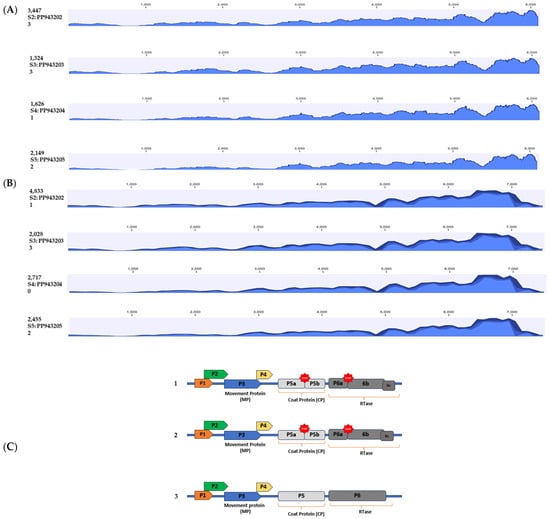 Read coverage map at each genome region, showing the maximum, minimum, and average coverage values with the reference sequence. Scaled genome positions of the virus are represented above the histogram and the Y-axis shows the coverage in number of reads. Within the specified peaks, from top to bottom, the colors represent: the maximum coverage (read counts), the average coverage value, and the minimum coverage value. Read coverage map of field samples EVE-GA’s (S2: PP943202; S3: PP943203; S4: PP943204; and S5: PP943205) with reference sequences (A) endogenous cotton pararetroviral elements (eCPRVE; OR269951) and (B) cotton virus A (CotV-A; OR184923). Schematic of genome organization of EVE sequences. (C) genome organization of endogenous viral elements, GA (1) compared to a putative eCPRVE (2) and CotV-A (3). Stop codons of the open reading frames (ORFs) coding for putative viral coat protein and reverse transcriptases are shown in red spots.