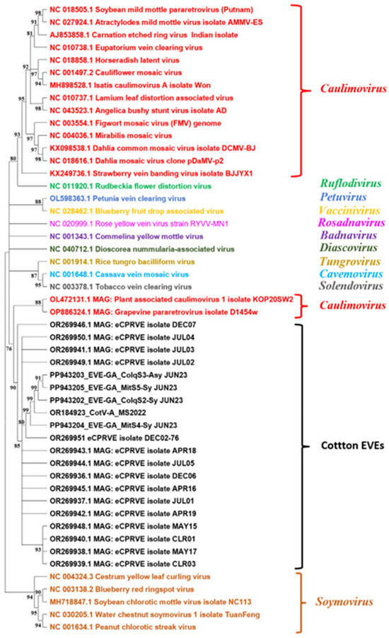Phylogenetic tree comparing near-complete sequences of endogenous viral elements (EVEs) obtained from field samples (S2: PP943202; S3: PP943203; S4: PP943204; and S5: PP943205) of GA in comparison to near-complete sequences of cotton virus A isolate, endogenous cotton pararetroviral elements (eCPRVE) DEC02-76 isolate, and various genera in the family Caulimoviridae. Color code represents similar genera.