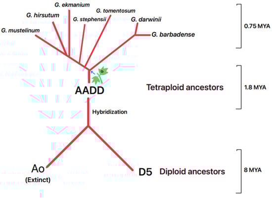 Graphic representation of the origin of tetraploid Gossypium spp. from their diploid ancestors indicated with timeline and possible virus integration event represented using a green cotton plant and a blue arrow.