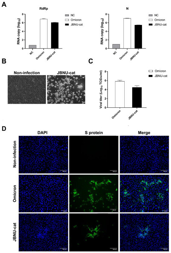 Following the initial identification, the JBNU-cat SARS-CoV-2 virus was successfully isolated and propagated in Vero E6 cells. This isolation was confirmed through the visualization of viral antigens within infected cells using fluorescence microscopy (Figure 1C,D). The isolated virus exhibited robust replication competence, achieving high viral titers and demonstrating the capacity for continuous passage in Vero E6 Cells, as evidenced by immunofluorescence assay data.