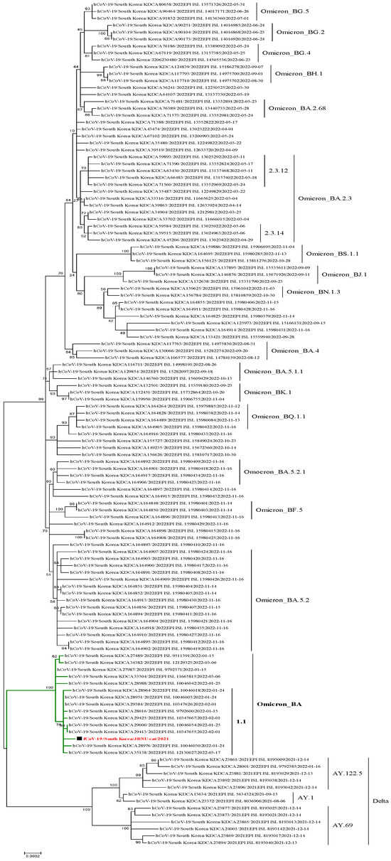 Raw sequencing reads were quality-controlled by trimming adapter sequences, removing dual indices, and filtering out low-quality reads. The remaining high-quality reads were aligned to the reference genome of hCoV-19/Wuhan/WIV04/2019 (EPI_ISL_402124) using CLC Genomics Workbench 8.0. A consensus genome sequence for the JBNU-cat/2022 strain was generated, which spanned 29,841 nucleotides and had an average coverage depth of 14,783×. The sequences of hCoV-19/South Korea/JBNU-cat/2022 were deposited in the GISAID database (https://www.gisaid.org) (accession numbers EPI_ISL_16577826). To analyze the phylogenetic relationship, a total of 121 SARS-CoV-2 patient samples collected from December 2021 to November 2022, along with the SARS-CoV-2 isolate from JBNU-cat, were included.